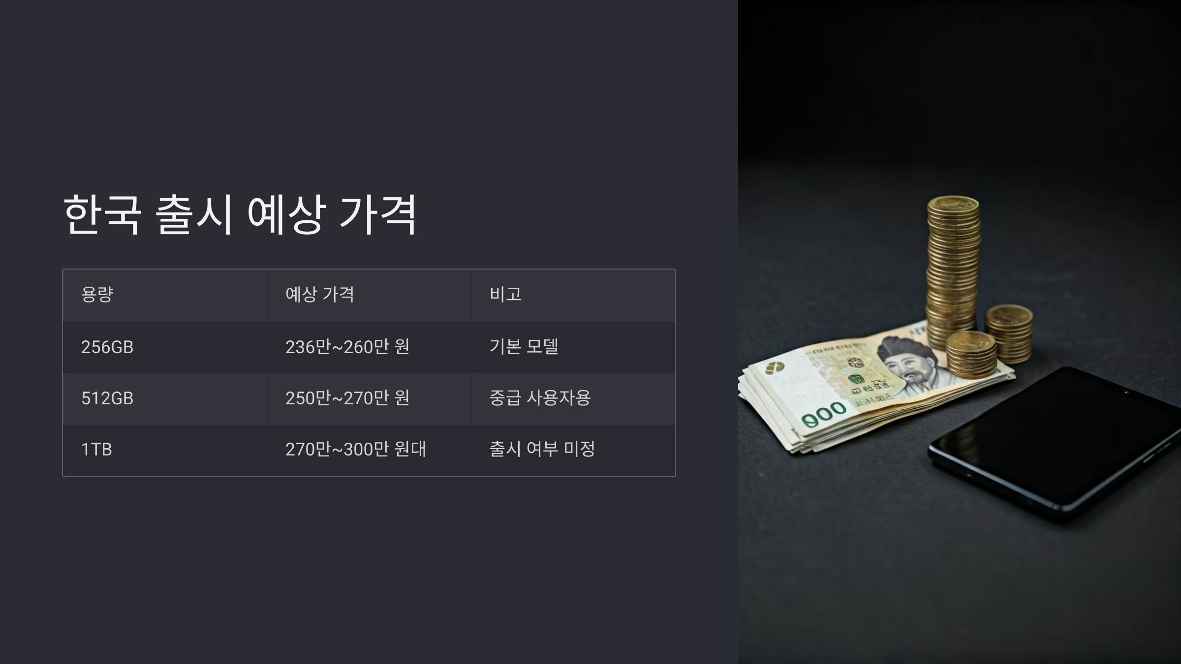 특히 1TB 모델은 정식 출시 여부가 아직 불투명하긴 하지만, 고용량 사용자에게는 매력적인 선택지가 될 수 있겠죠.
