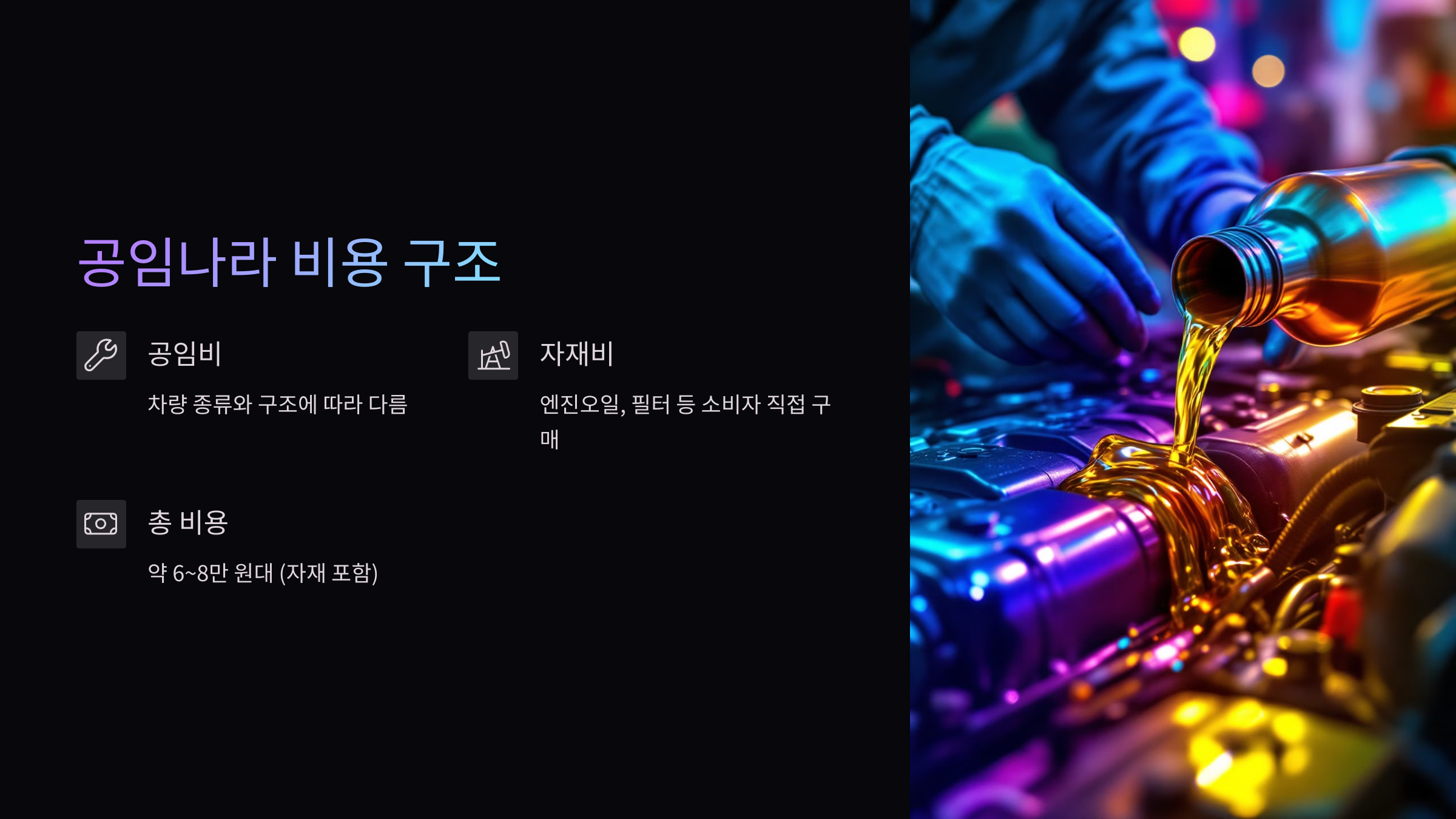 공임나라의 엔진오일 교체 비용은 크게 공임비(작업비)와 자재비(엔진오일, 필터 등)로 구성돼요.