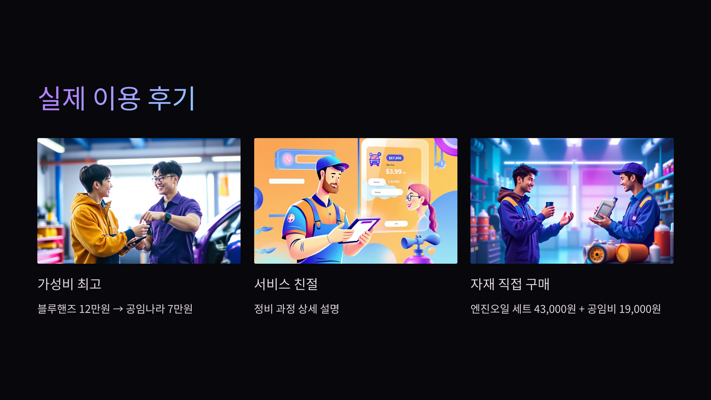 한 운전자는 “현대 블루핸즈에서 12만 원 하던 오일 교환을 7만 원에 해결했다”며 만족감을 표현했고,