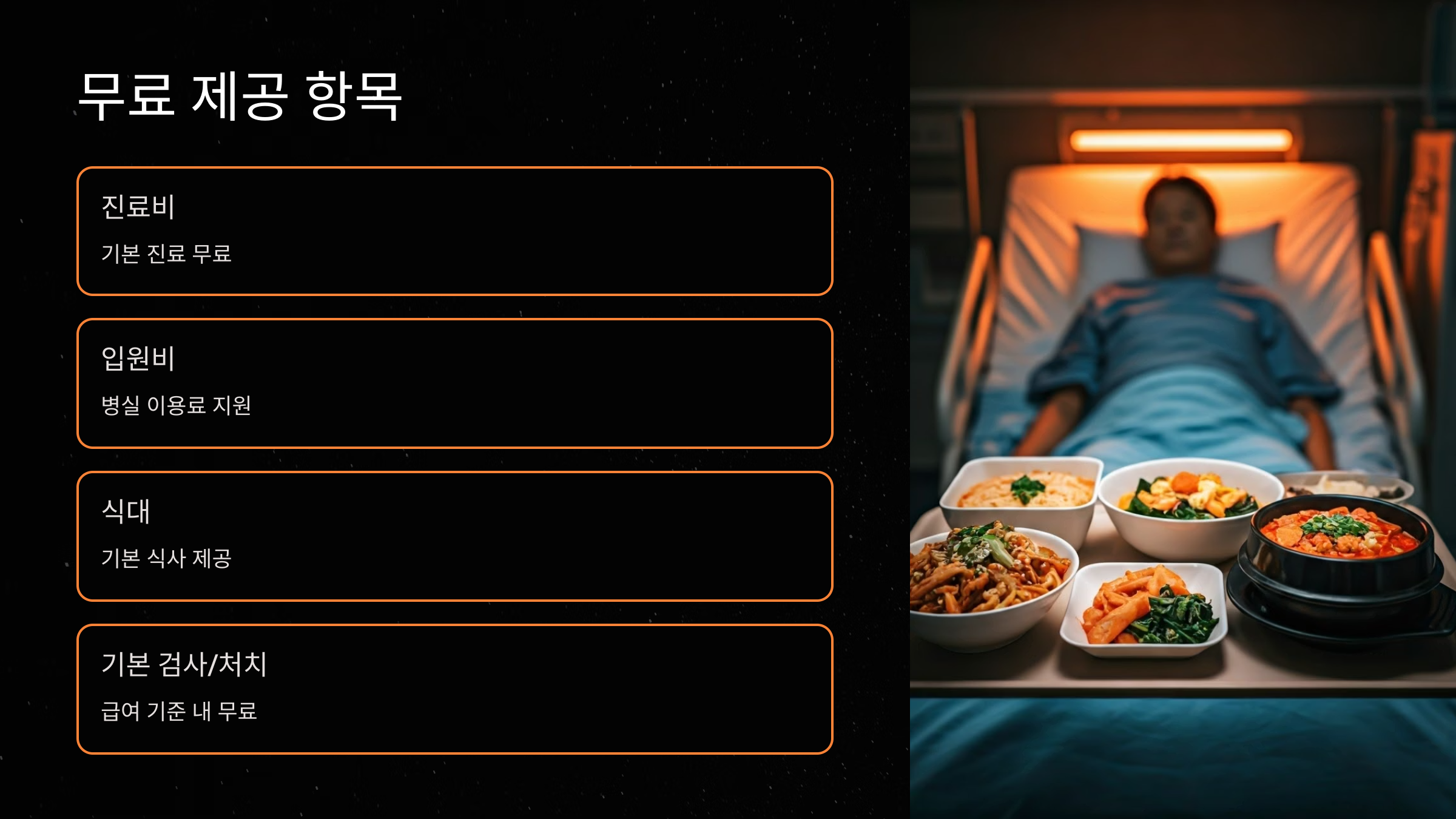 | 입원비 / 진료비 / 식대 | 무료 또는 매우 낮은 금액 (1종, 2종 구분 있음) |