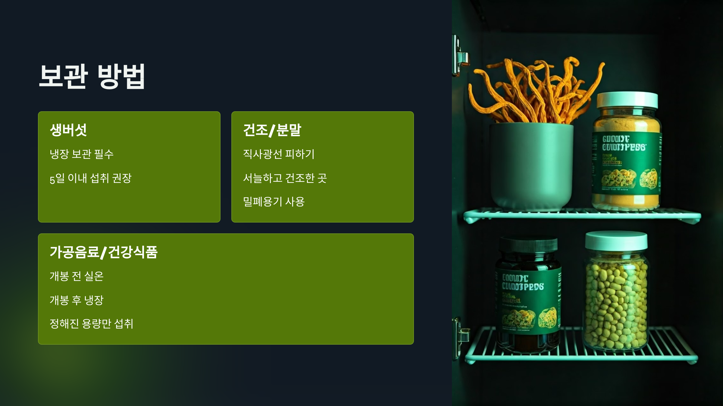 🔖 체크포인트 5: 함량 정보를 꼼꼼히 확인하세요. 동충하초 추출물의 mg 수치는 제품 간 큰 차이를 만듭니다.