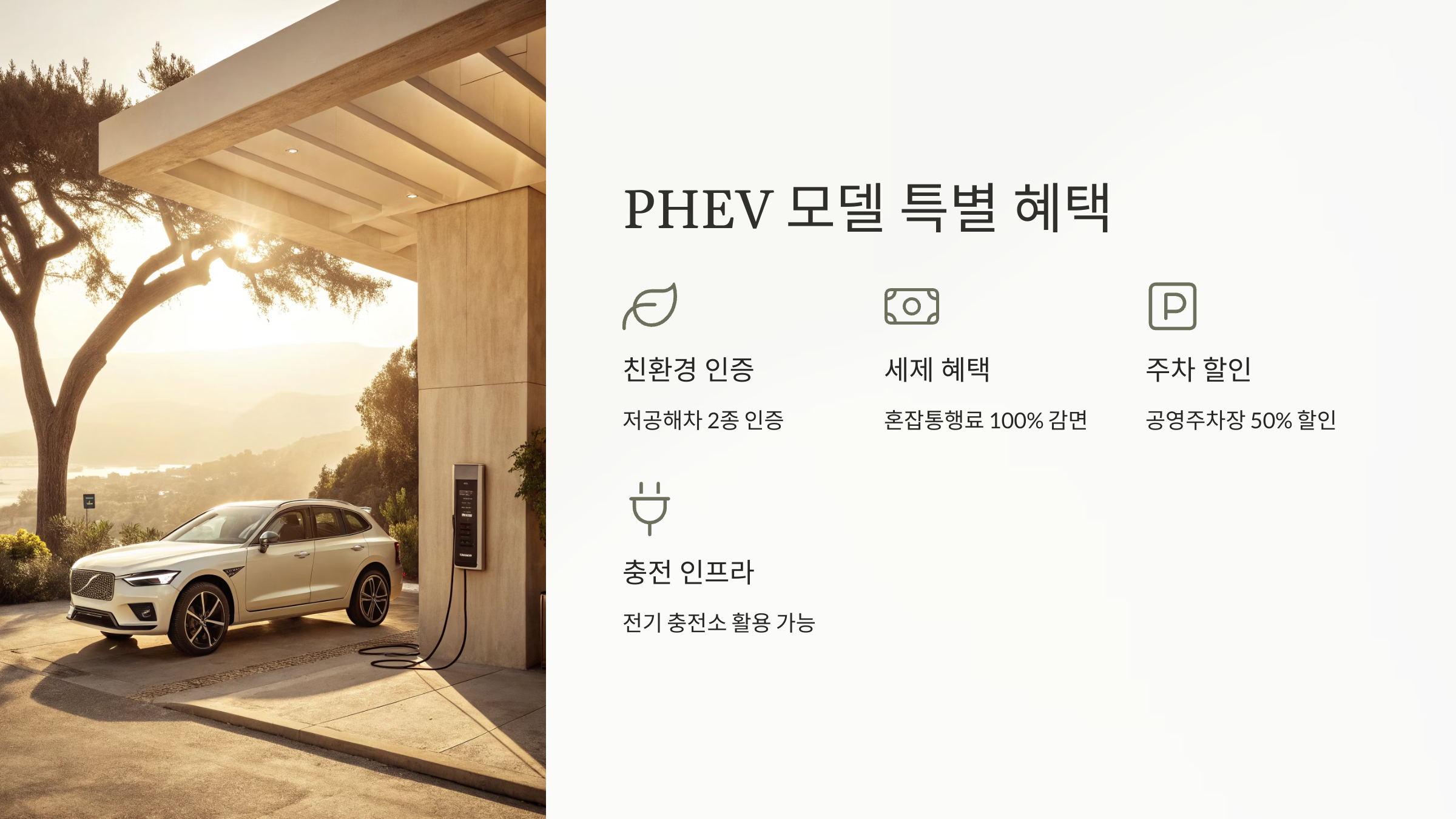 PHEV 모델은 저공해 2종 차량으로 등록되며, 혼잡통행료 감면과 주차 요금 할인 등의 혜택이 있습니다.