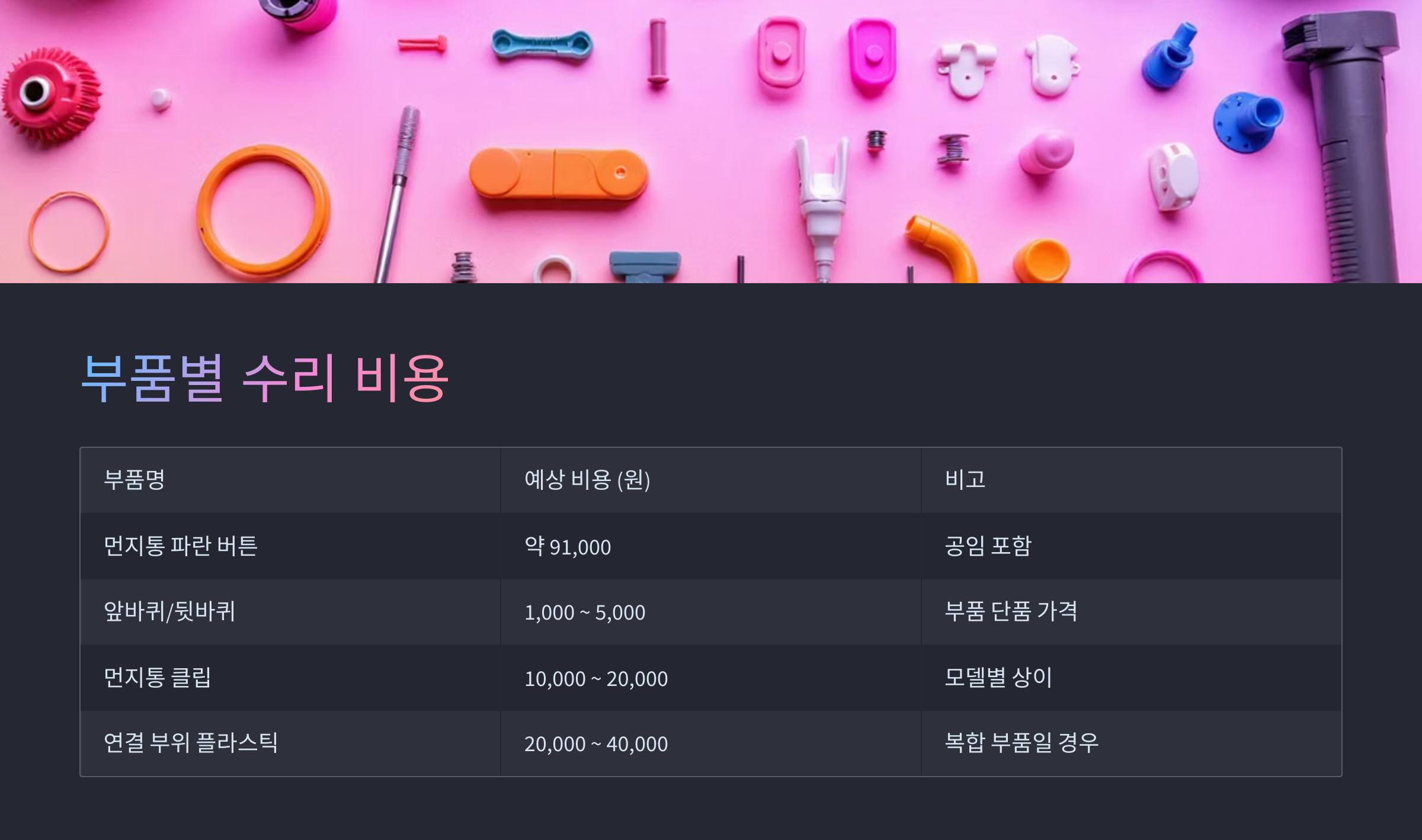 간단히 정리된 표를 통해 주요 부품들의 수리 예상 비용을 확인해볼게요.