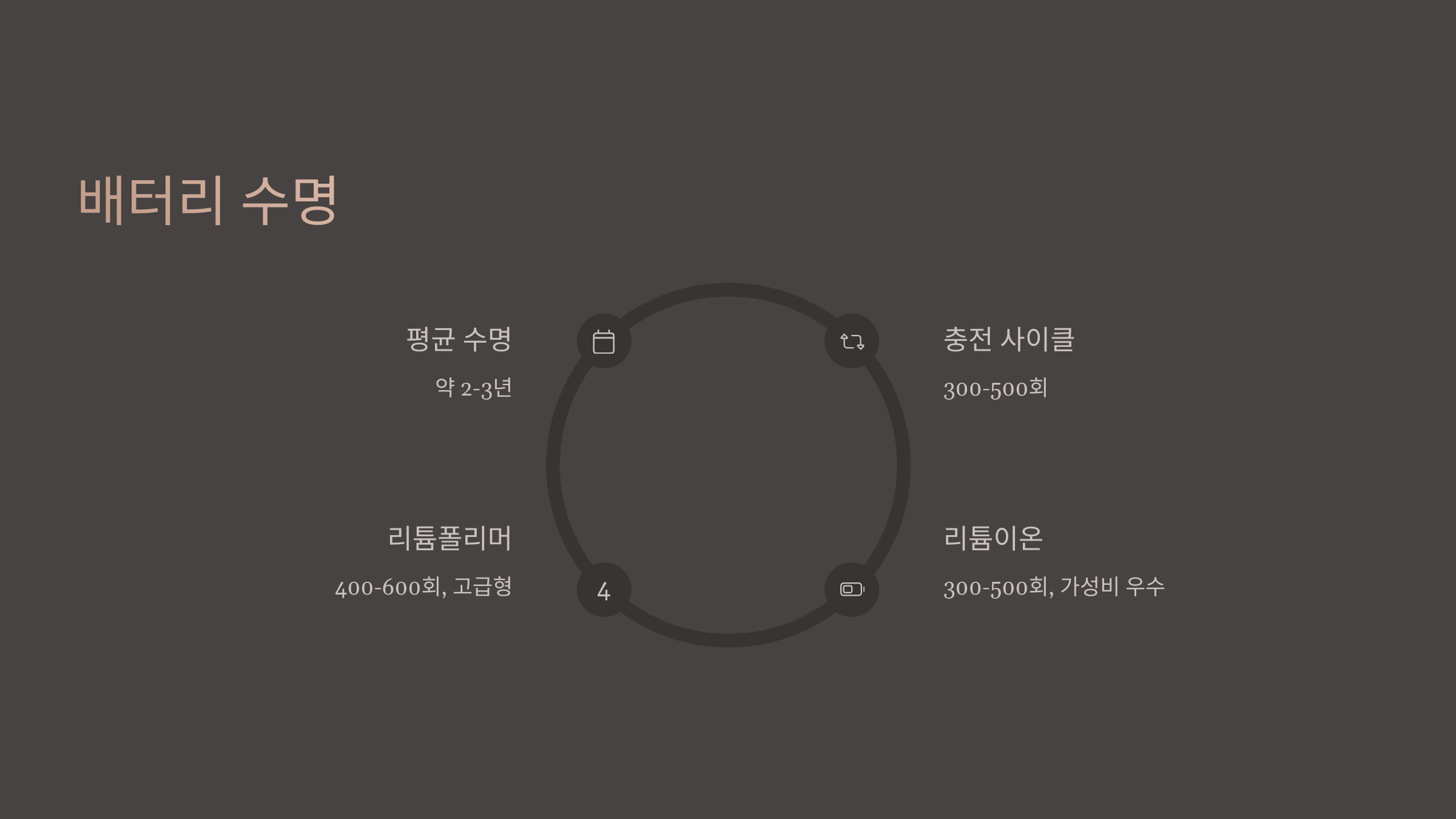 | 배터리 유형 | 평균 수명 (충전 사이클) | 특징 |