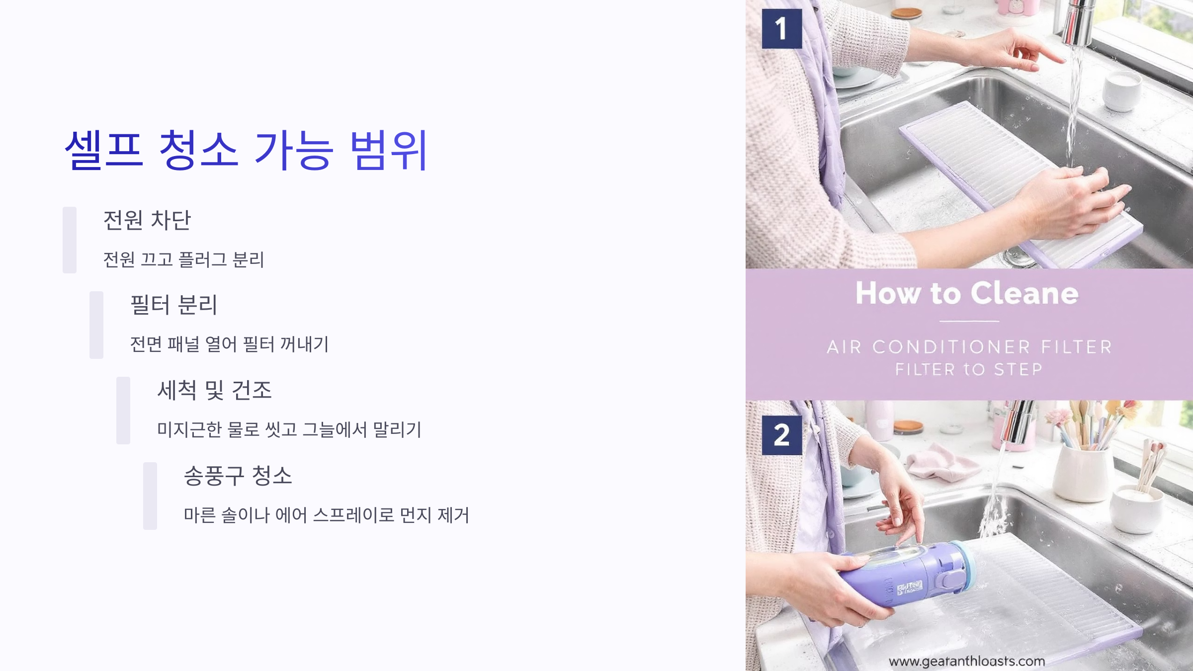 하지만 내부 열교환기, 배수관, 곰팡이 제거 등은 전문가의 손길이 필요한 부분이니 무리한 시도는 삼가주세요!