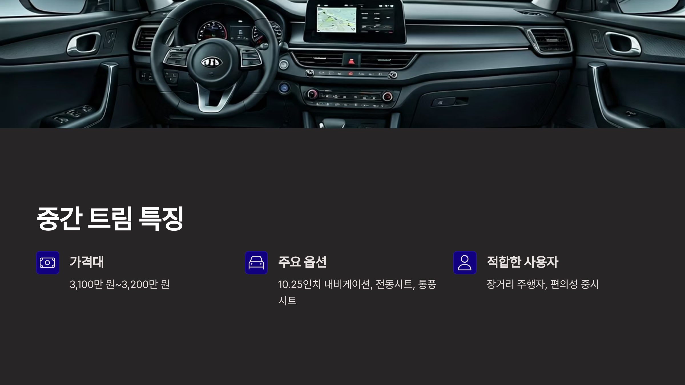 중간 트림은 기본 트림보다 한 단계 업그레이드된 편의 사양과 외관 디자인이 추가돼 실용성과 스타일을 동시에 잡고 싶을 때 고려하기 좋아요.