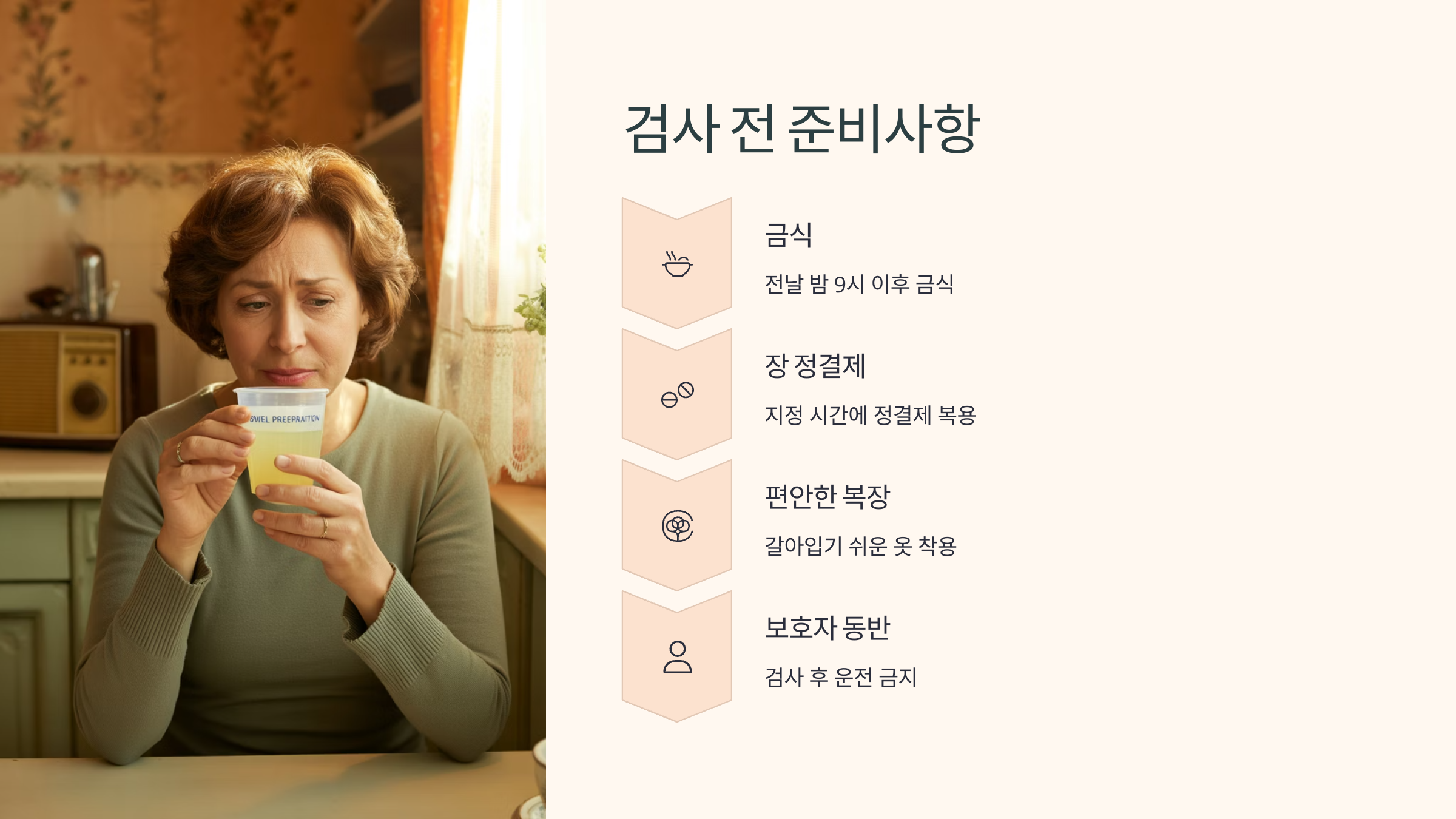 💡 TIP: 전날 저녁에는 고섬유질 음식이나 씨 있는 과일은 피하고, 흰죽이나 미음 위주로 섭취하세요!