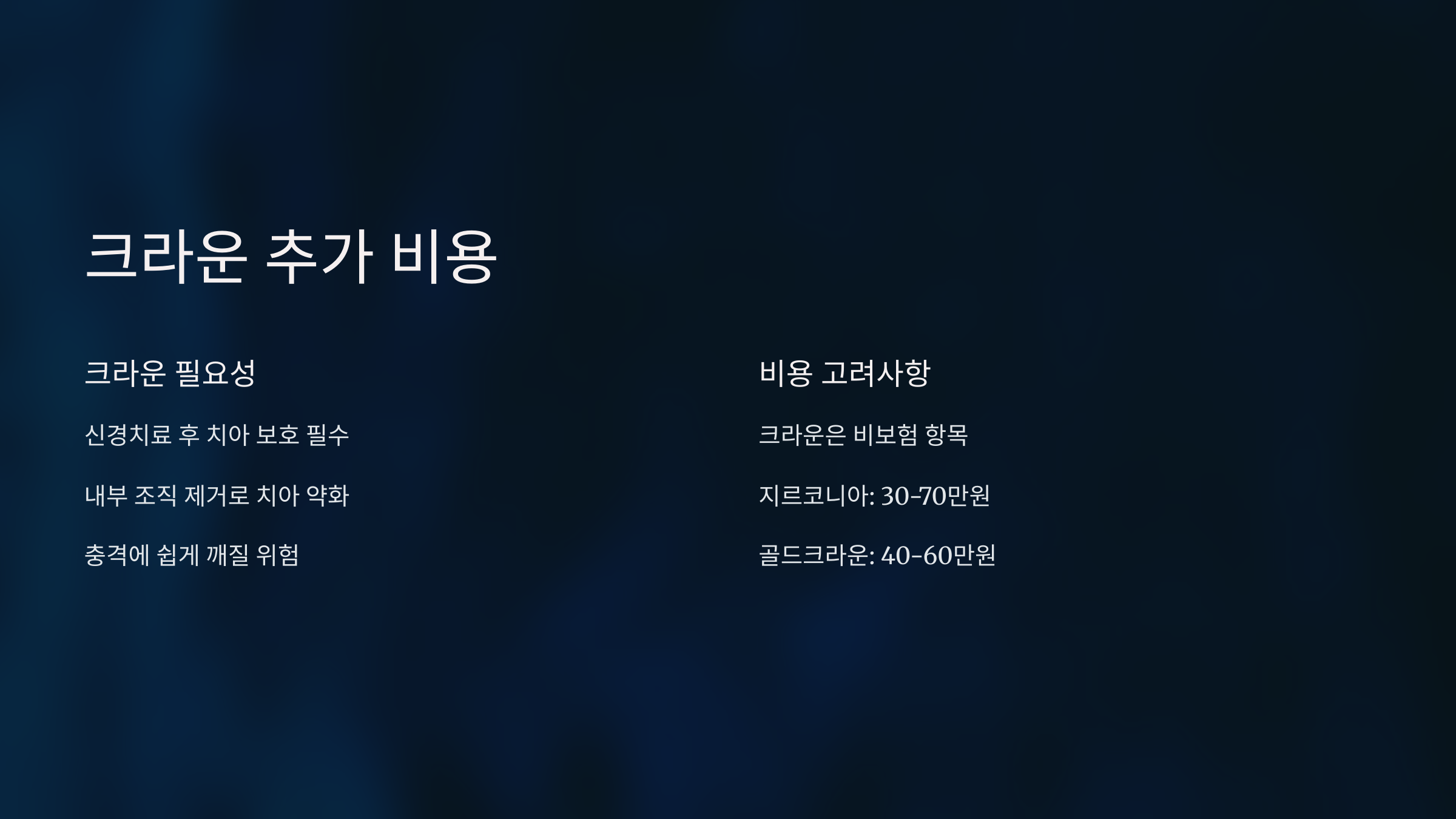 🔖 5. 보철 여부: 크라운 등 보철 추가 시 큰 비용이 발생해요.