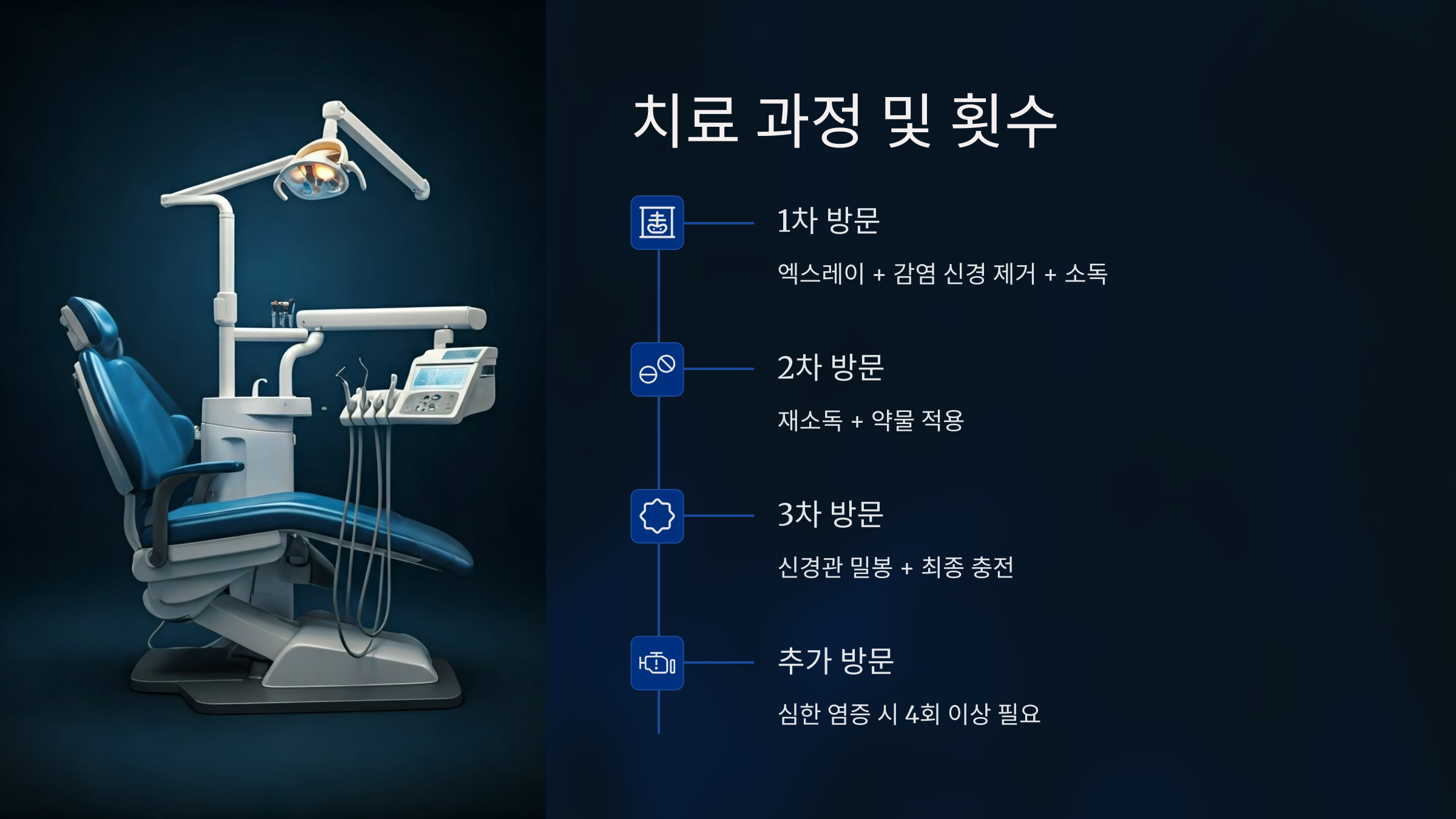 신경치료는 보통 1회에 끝나지 않아요. 대부분 2~3회 내원이 필요해요.