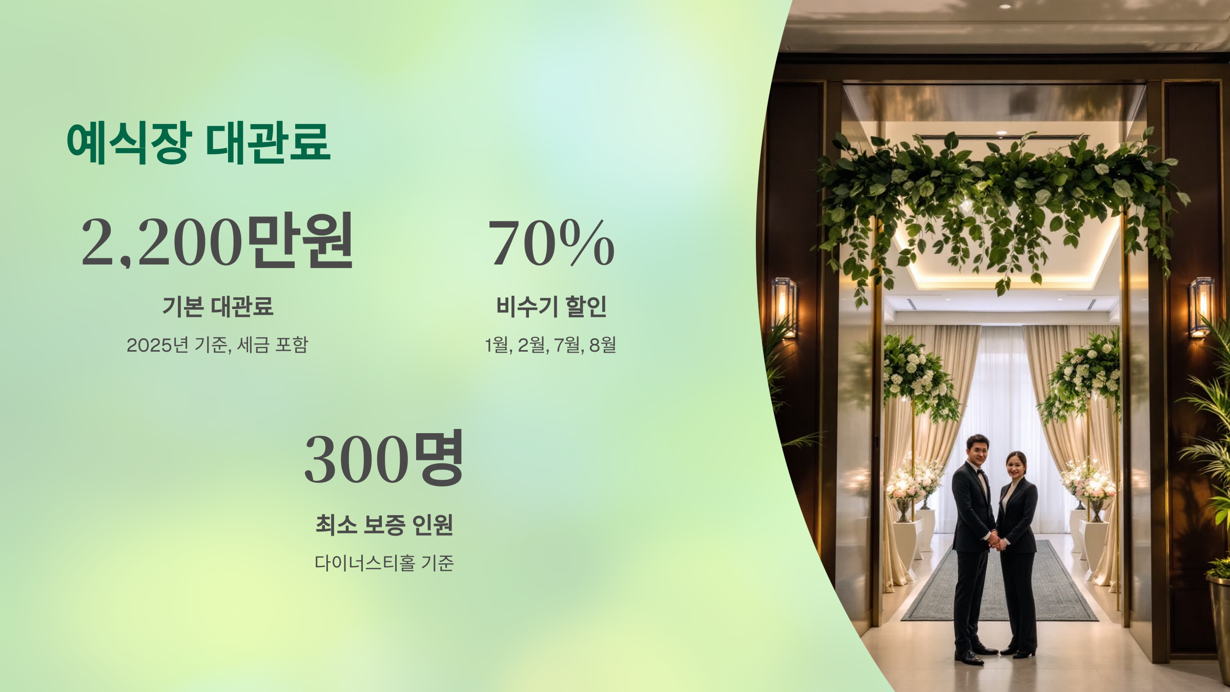 이때는 최대 70%까지 대관료 할인이 가능하고, 식대도 10~20% 할인이 적용되는 경우가 많아요.
