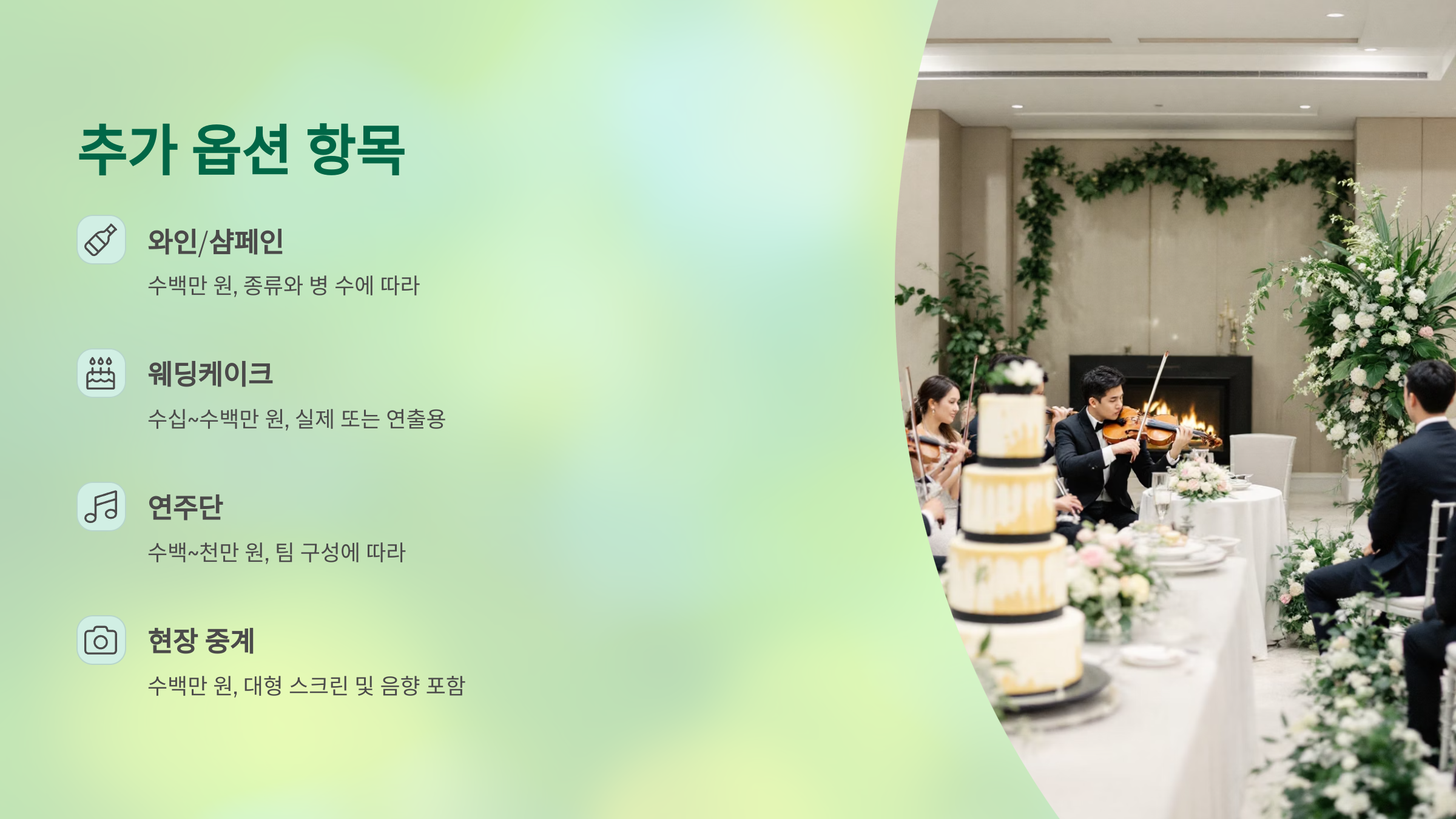 각 옵션은 예식의 성격과 신랑신부의 연출 방향에 따라 결정되며, 최소 수백만 원부터 수천만 원까지 다양합니다.