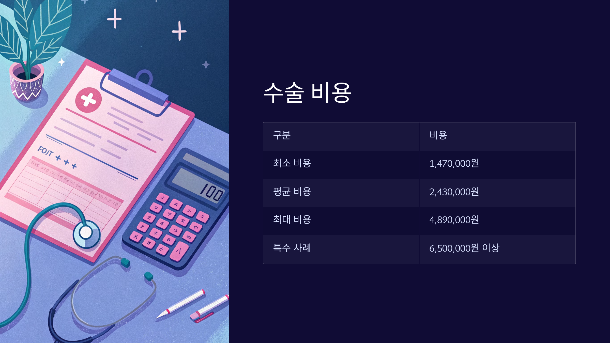 다만, 수술의 복잡도나 병원 등급에 따라 최소 147만 원부터, 최대 489만 원까지 다양하게 형성되어 있어요.