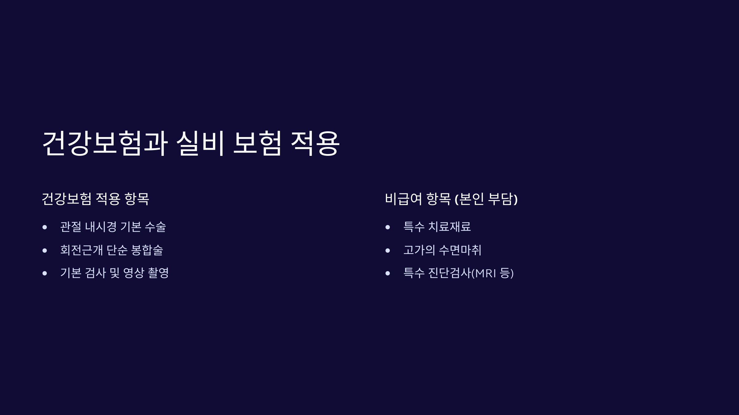 좋은 소식은, 대부분의 어깨 관절경 수술은 건강보험 적용이 가능하다는 점이에요.