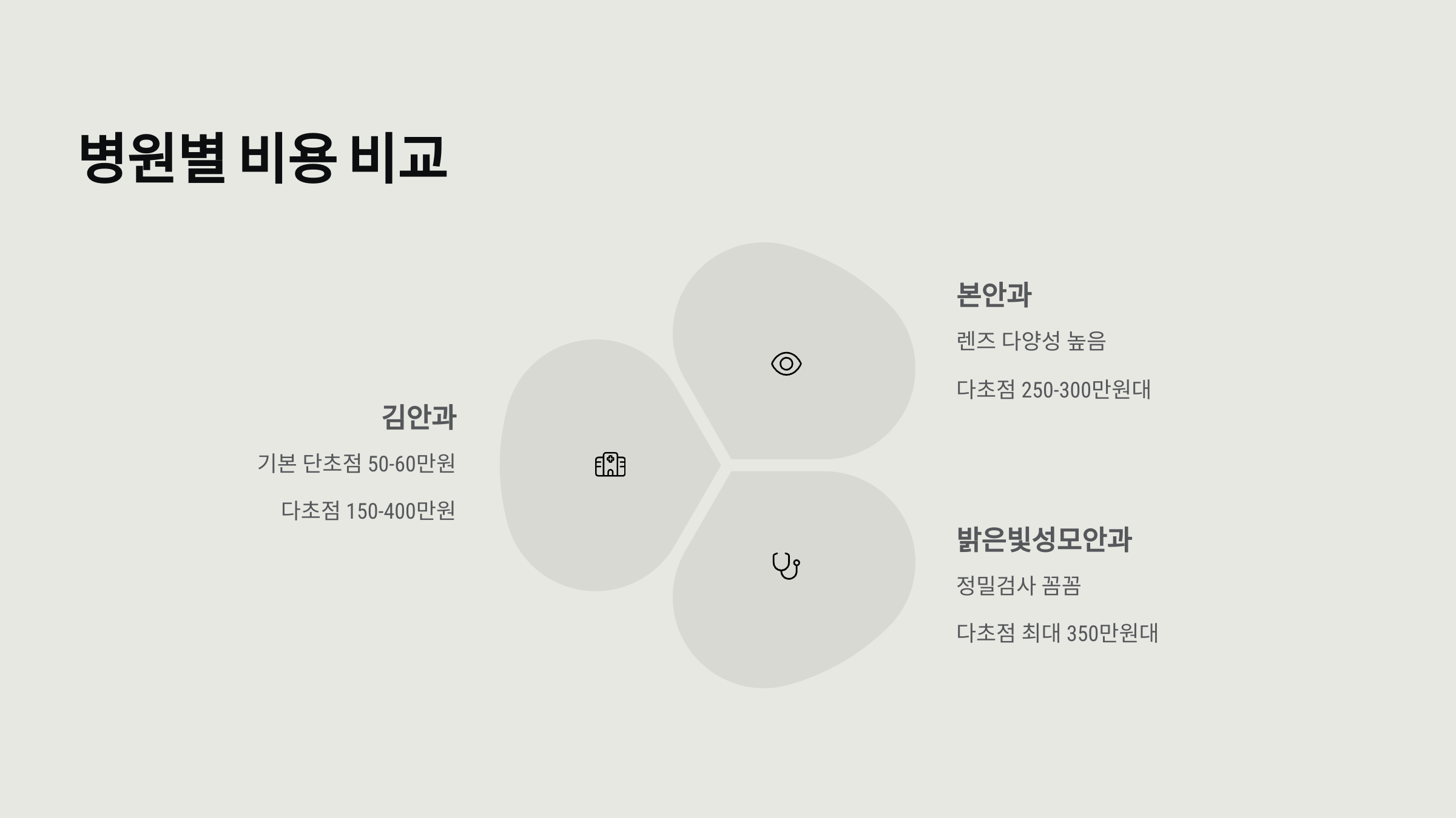 대표적으로 본안과, 밝은빛성모안과 등이 있으며 비용 구조는 유사하지만 렌즈 브랜드, 검사 서비스 등이 다를 수 있습니다.
