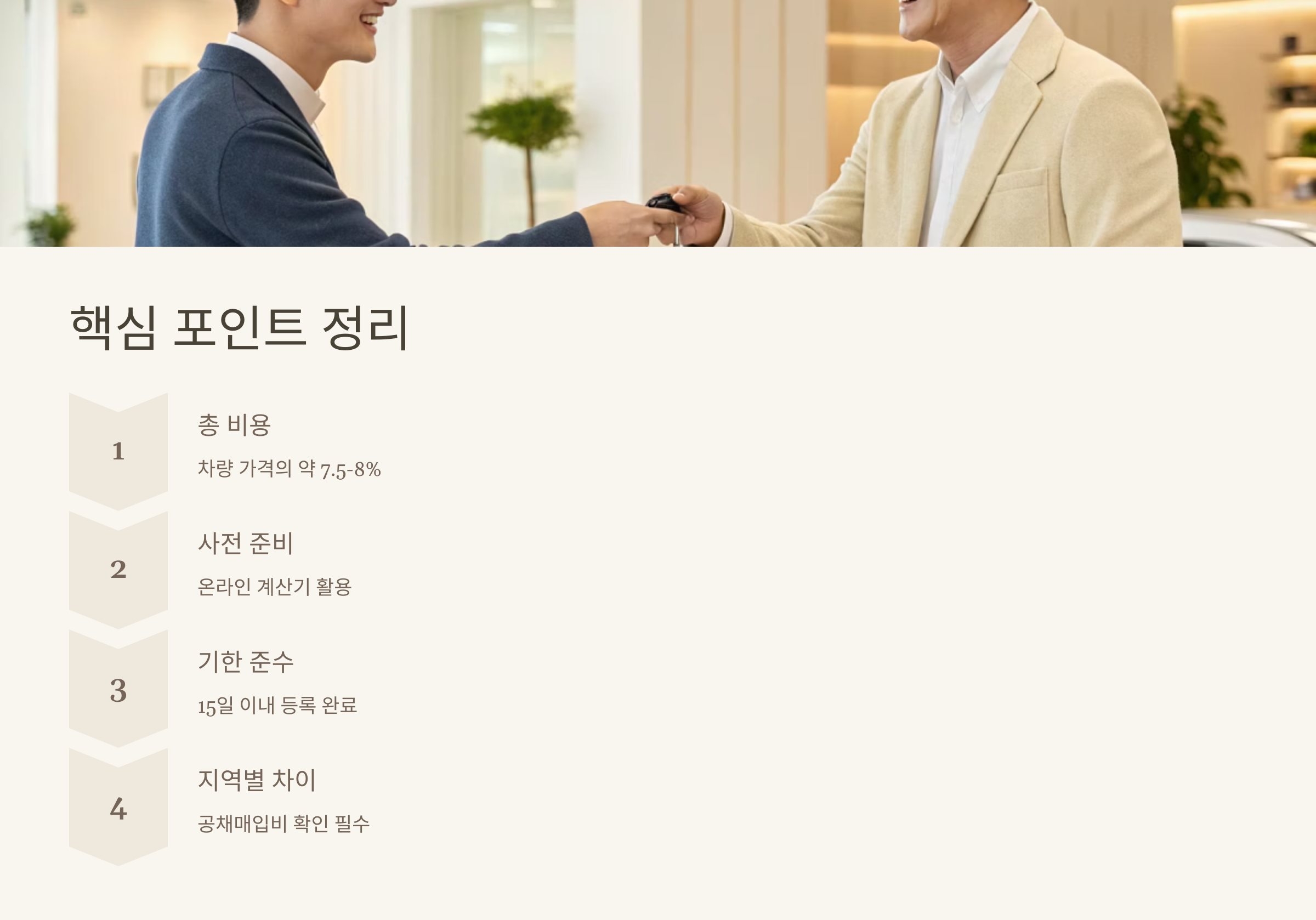 💡 TIP: 명의이전 비용은 차량 가격, 지역, 차종에 따라 달라지므로 사전에 온라인 계산기를 활용해보세요!