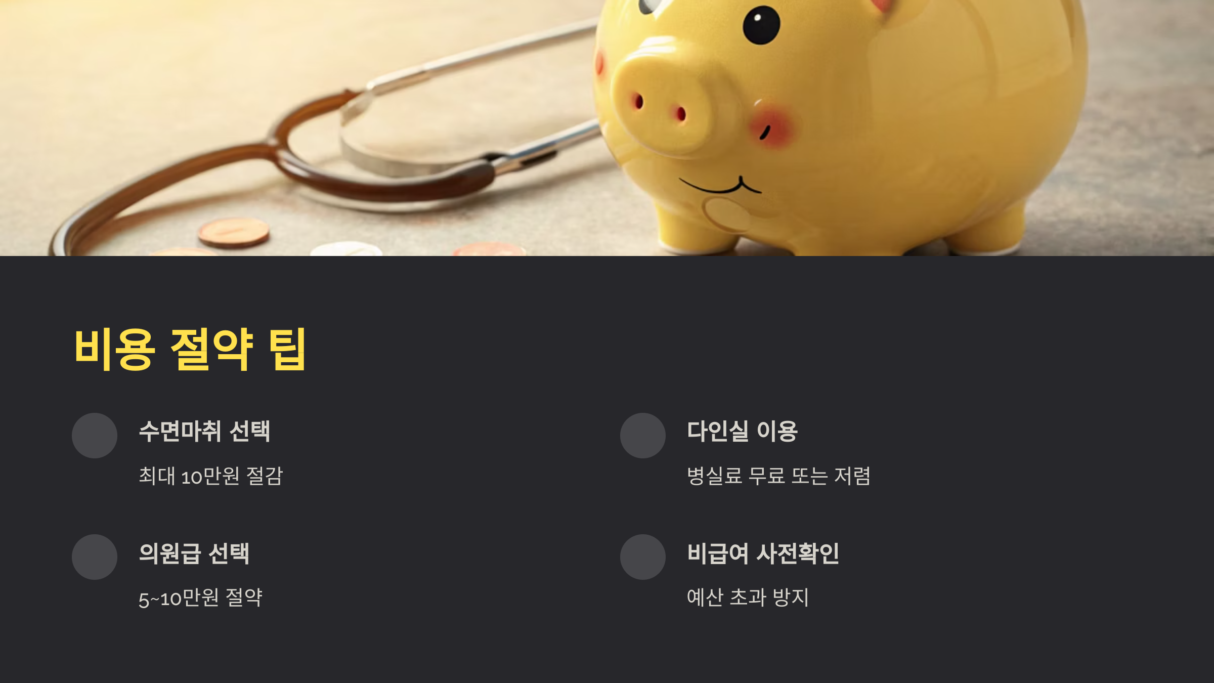 비용을 절감하고 싶다면, 수술 전 상담 때 모든 비용 항목을 물어보는 게 가장 확실한 방법이에요!