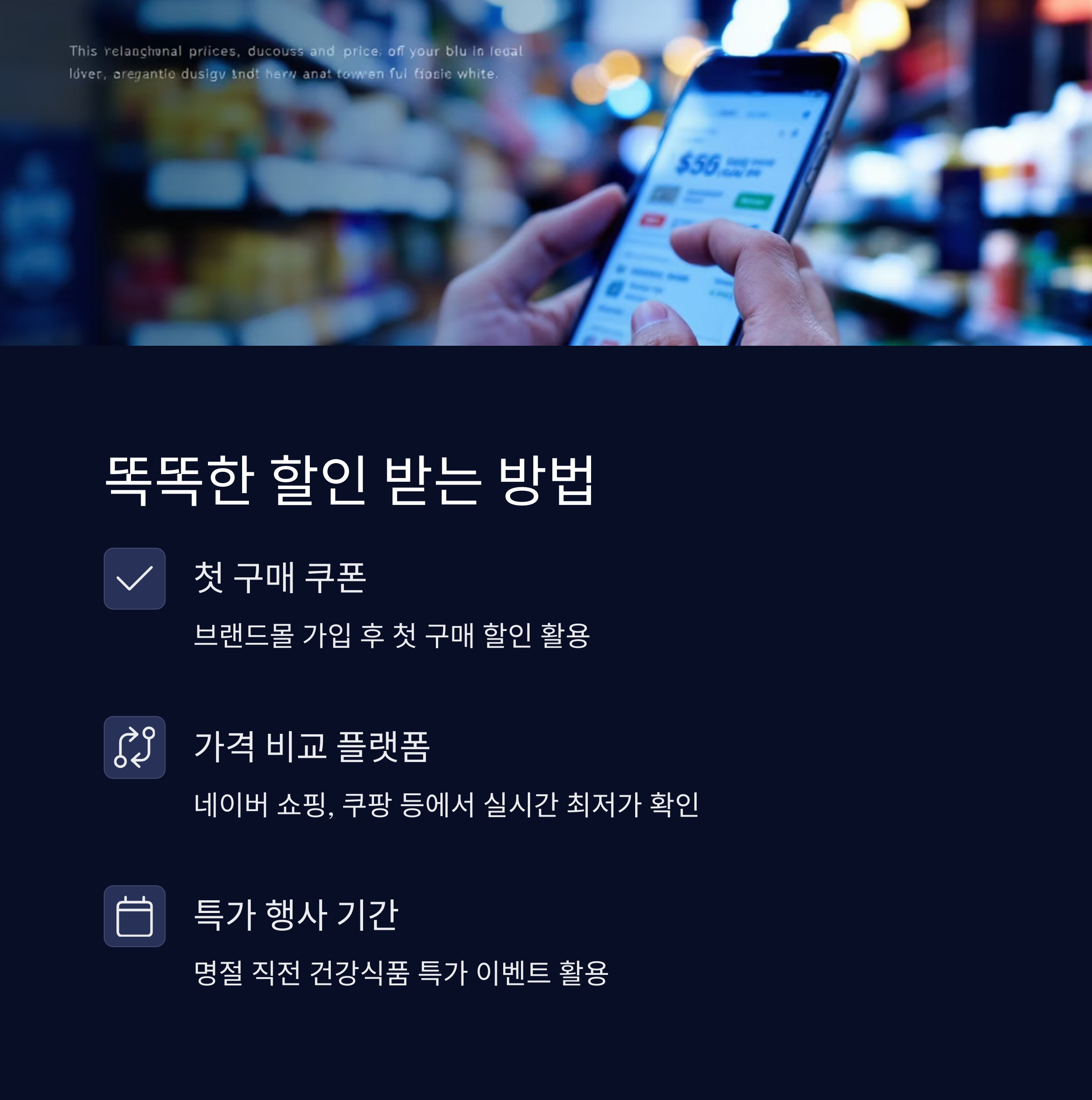 - 특가 행사 기간 노리기 – 설, 추석 명절 직전에는 건강식품 특가 이벤트 많아요.