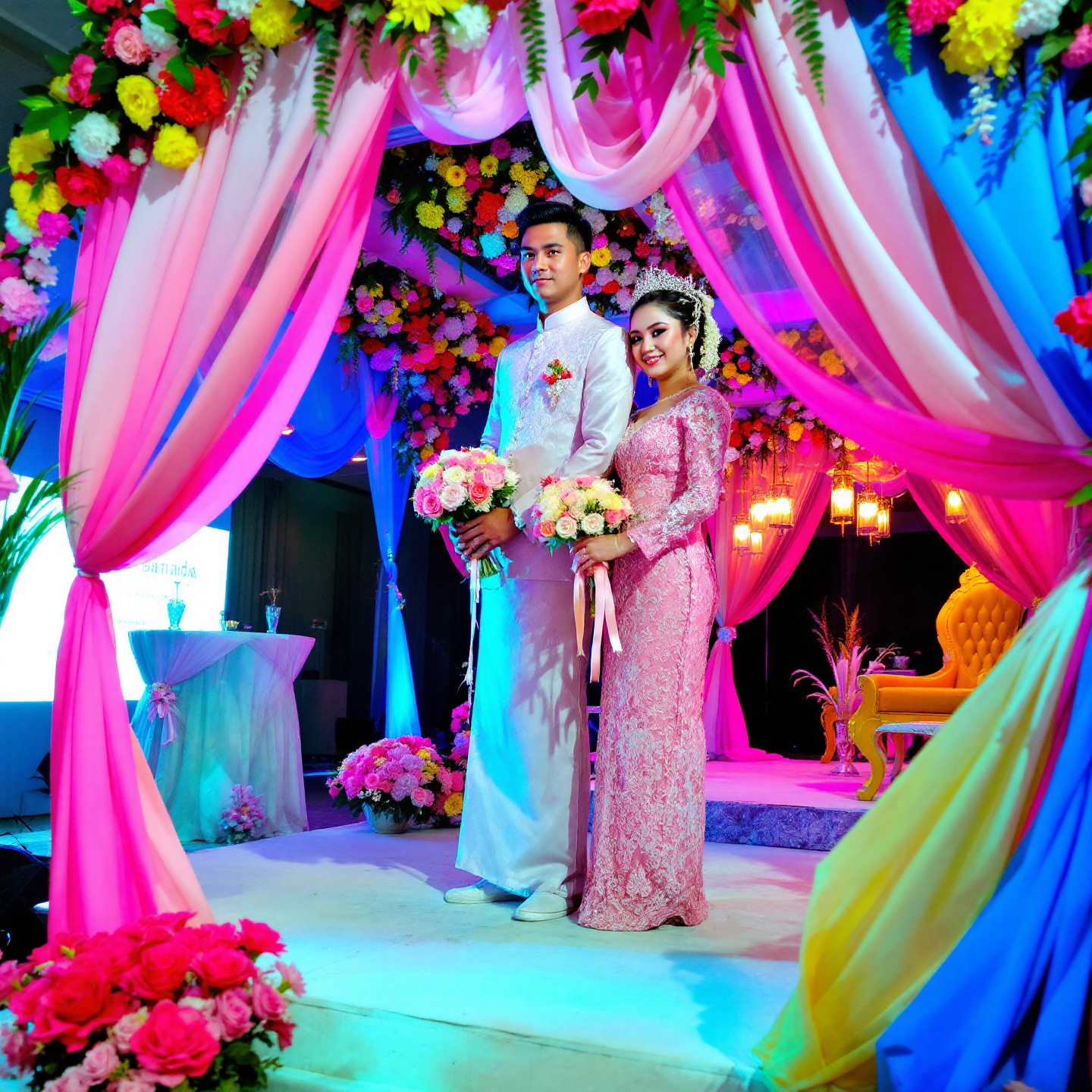 캄보디아 전통 결혼식에서는 복장 대여와 장식에 많은 비용이 들어요.
