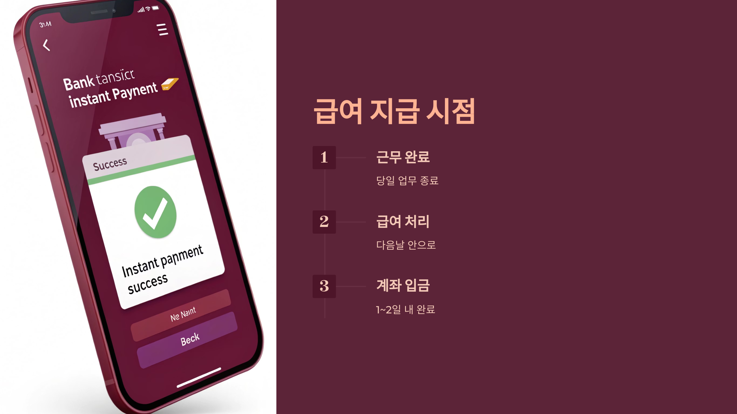 일반적으로는 근무 다음날 안으로 계좌에 입금되며, 특수한 경우에도 1~2일 내 처리됩니다.