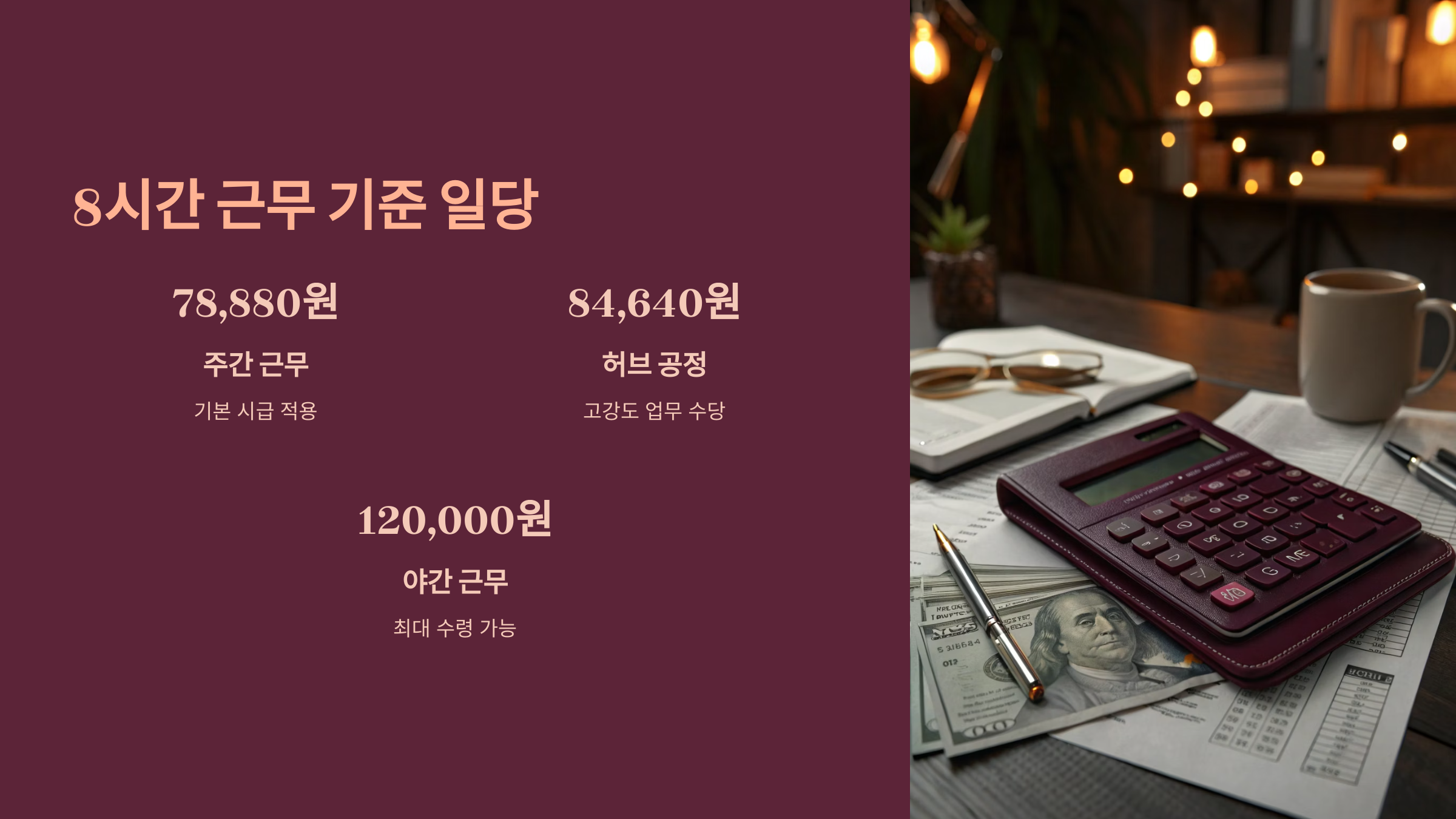 - 주간 근무 (기본): 9,860원 × 8시간 = 약 78,880원