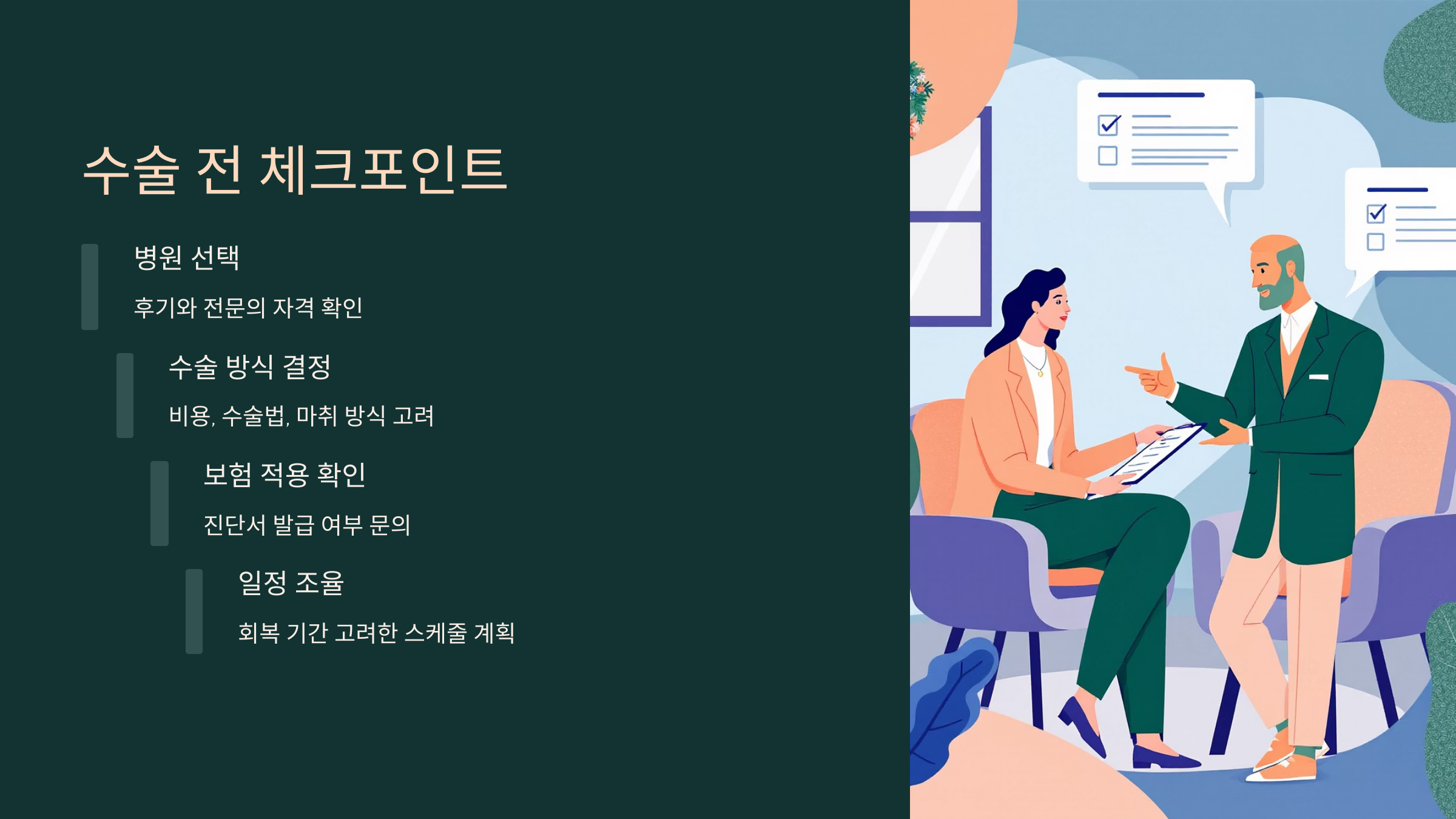 🔖 체크포인트 4: 수술 후 1개월은 조심해야 하므로, 일정도 미리 조율해두는 것이 좋습니다.