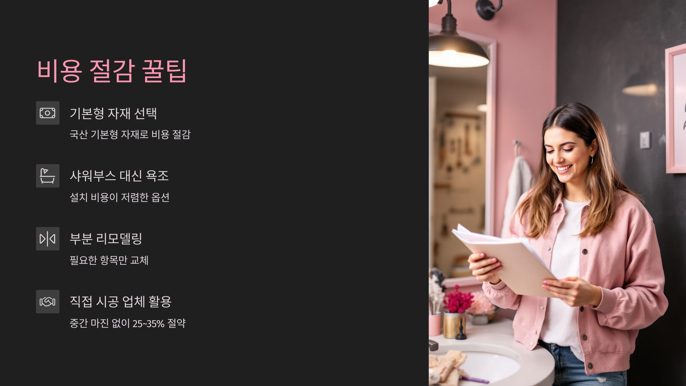 - 🔖 직접 시공 업체 활용: 중간 마진이 없어 25~35% 절약 가능