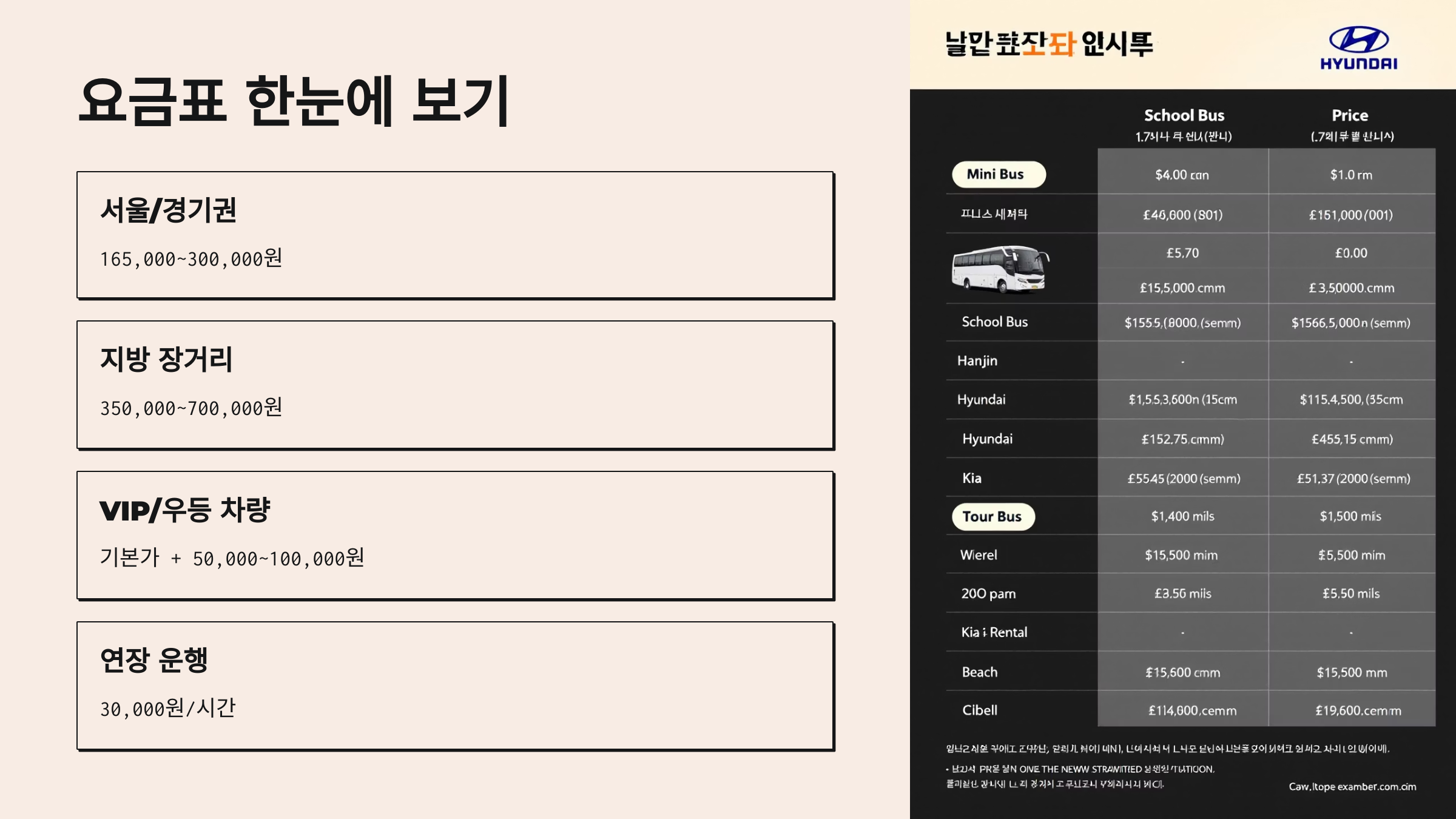 왜냐하면 운행 거리, 지역, 계절, 기사 포함 여부 등 다양한 요소에 따라 가격이 천차만별이기 때문이죠!