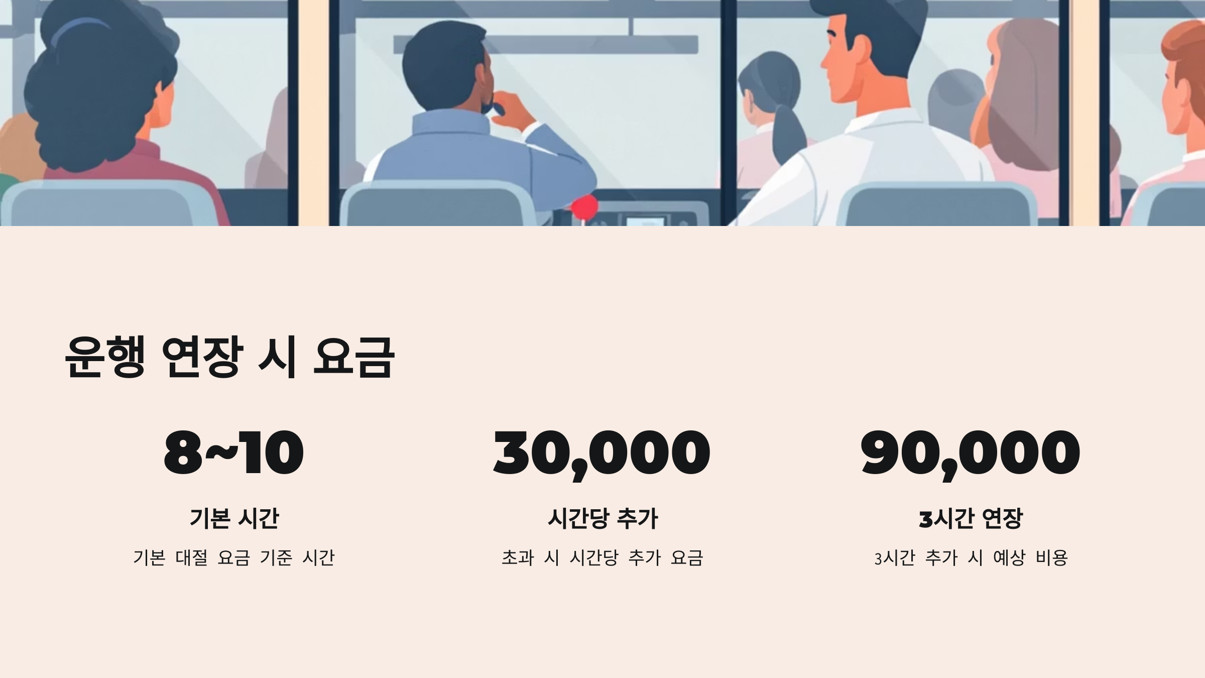그래서 운행 시간이 조금이라도 늘어날 여지가 있다면, 사전에 여유 있게 예약 조건을 조율하는 것이 좋아요.